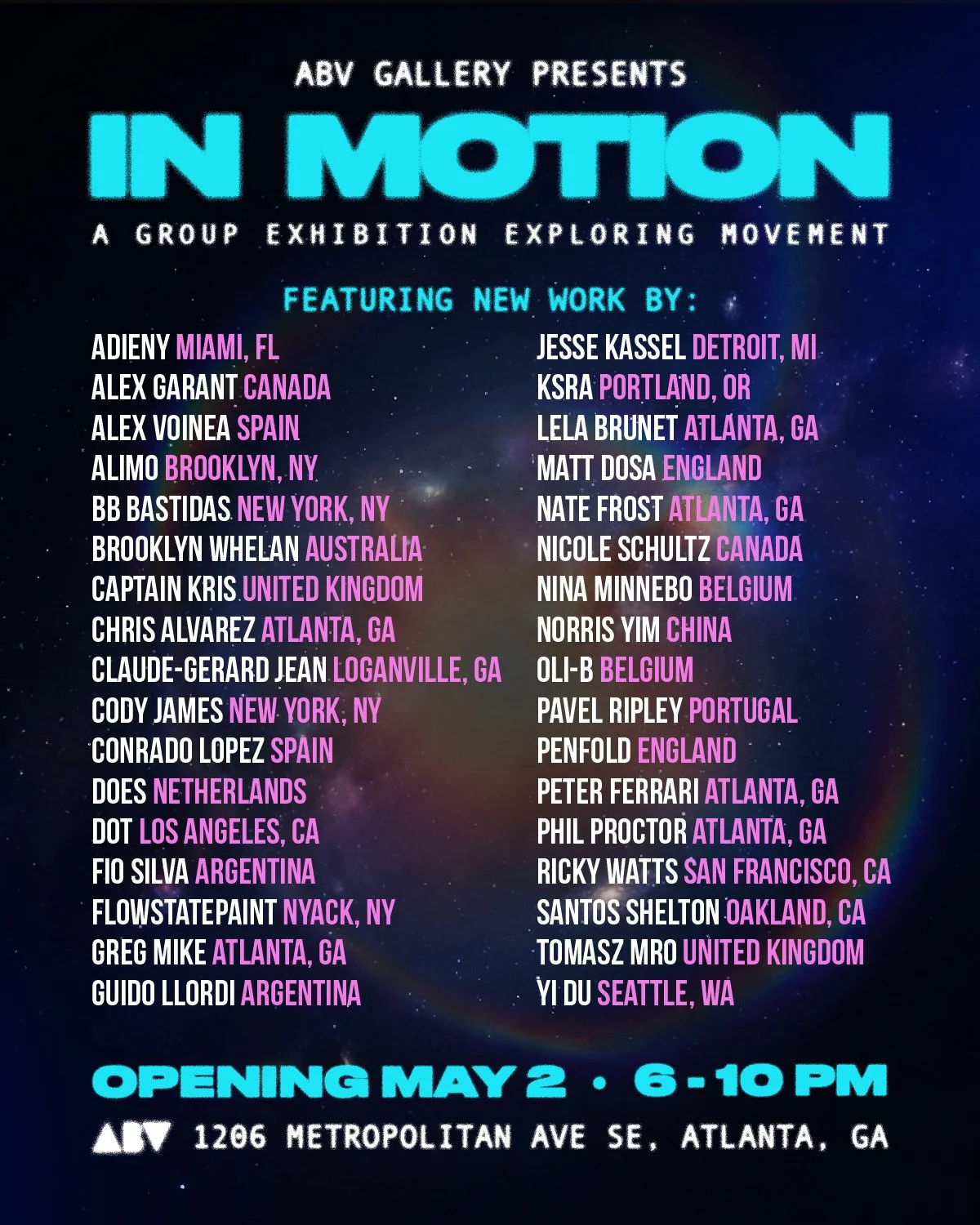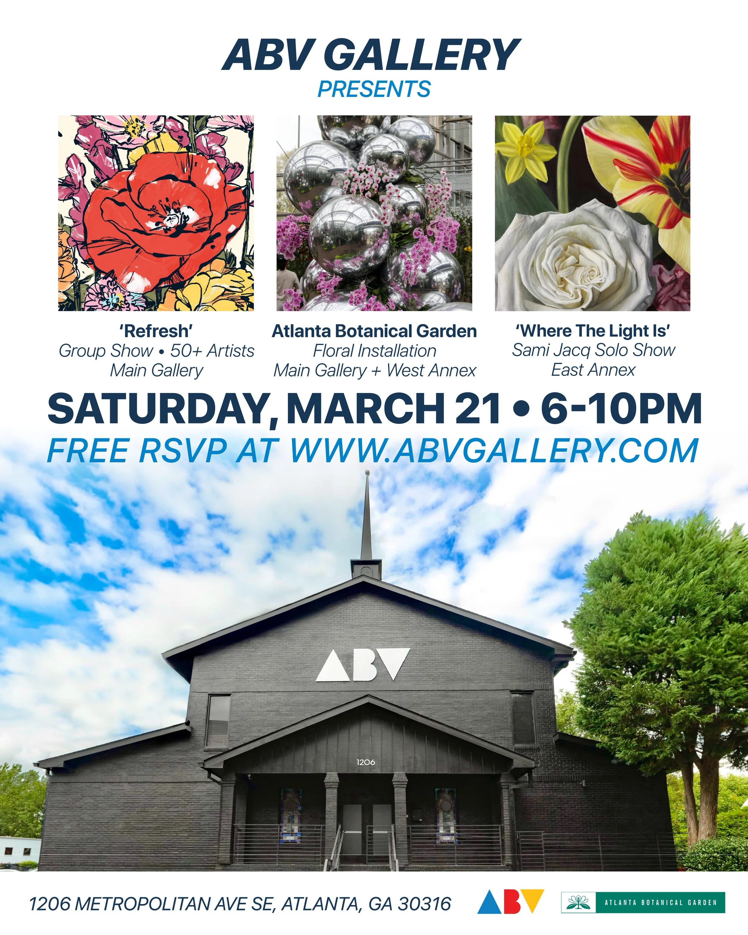 ABV Gallery is a contemporary art gallery in Atlanta presenting rotating exhibitions featuring artists from Atlanta and around the world. Each exhibition transforms the space with new paintings, installations, murals, sculptures, and experimental works that explore the evolving landscape of contemporary visual culture.